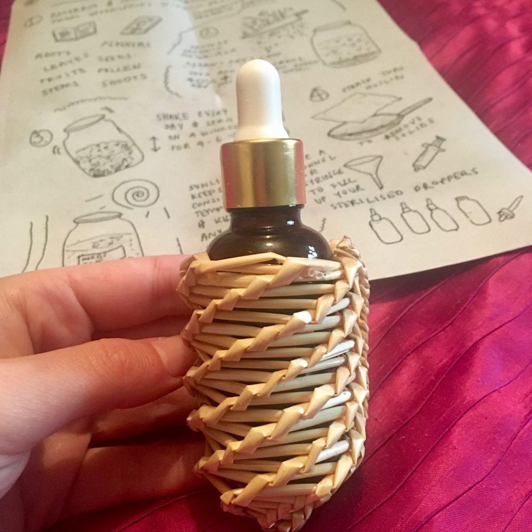 Organic grain alcohol tincture and ex-industry amber glass dropper in a hand-made wheat amphora