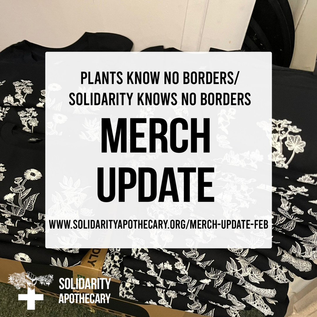 Thank you SO much for your incredible support for the Mobile Herbal Clinic Calais this January! Here is a little update on your orders for Solidarity Knows No Borders and Plants Know No Borders hoodies, t-shirts, aprons, tea towels and patches.