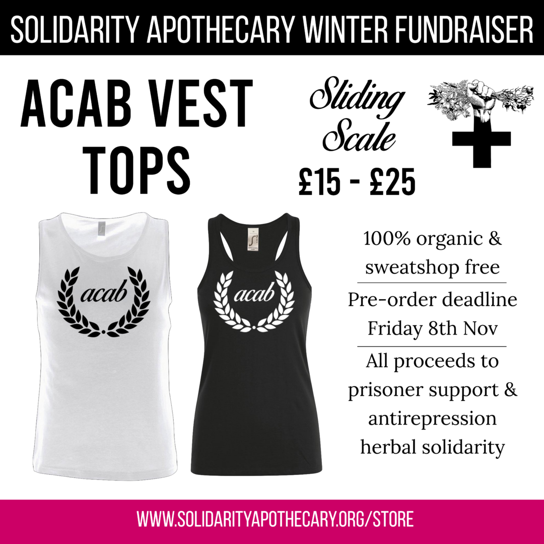New ACAB merch! The long awaited vest tops and t-shirts are here! All funds will be used for posting the Prisoner Herbals books to prisoners and covering medicine making expenses for herbal care packages for people experiencing repression.