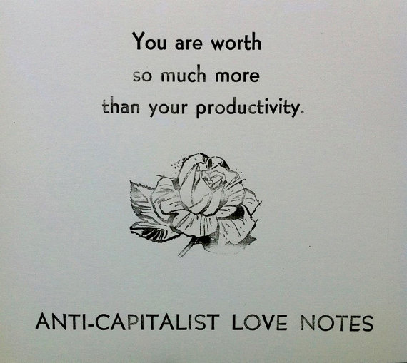 I thought to myself, this is ok because I want to be productive in struggle; I’m not learning to be productive to appease a boss. It is valuable to know how to get shit done quickly and efficiently. Yet in doing this uncritically, I have still been perpetuating this oppressive worldview that those that are productive have more worth and value.