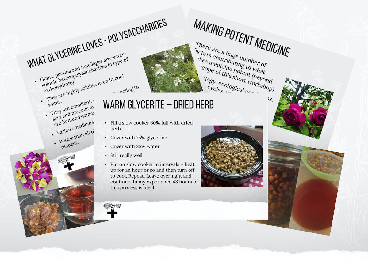 - All the practical elements of glycerite making (cold, warm, fresh herbs, dried herbs, multiple herbs and more).