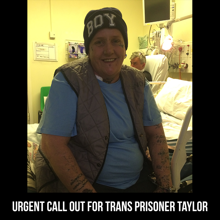 Taylor is one of my best friends and in need of support. He is a trans prisoner and slit his own throat this week after transphobic abuse and discrimination from prison staff. His mental health is at an all time low and he would really appreciate any cards or emails.