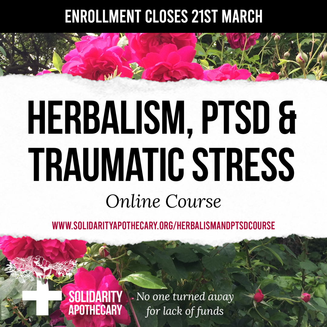 - To enrol at the resourced rate: https://solidarityapothecary.org/product/herbalism-ptsd-traumatic-stress-course-resourced-price/